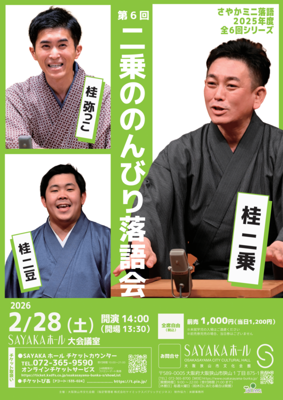 会場 大会議室 主催 大阪狭山市文化会館(指定管理者 株式会社ケイミックスパブリックビジネス) 制作協力 三栄企画(4月・8月・12月)/ 米朝事務所(6月・10月・2月)